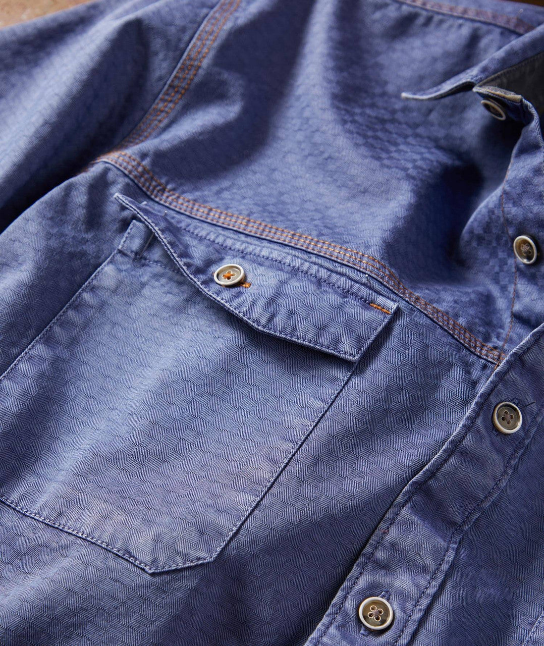 Denim-style dance with a few new steps. Herringbone checks give it life and lift. Amber jean stitches give it punch. Yoke seam chest. Button-flap pockets. Garment dyed and washed for perfect tone.Â