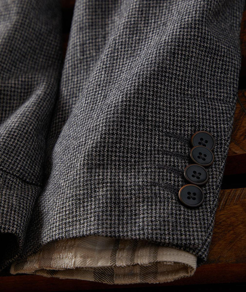 Classic good looks and European design come together in this refined micro-houndstooth blazer. Unlined for maximum breathability and optimum drape, it has a notched collar with a heritage buttonhole lapel. Welt chest pocket, three button front, and single back vent. Finished with bound French seams for smooth on-off.