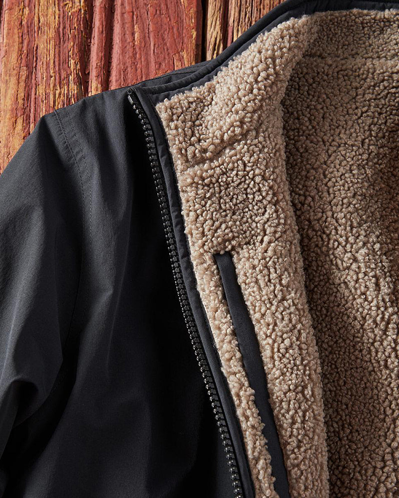 Reversible water-resistant nylon-spandex on one side, supremely cozy sherpa poly fleece on the other. This jacket offers minimalist good looks and cool functionality, including a hidden zip pocket along the inner zip placket for secure stashing. Jersey-lined side entry hand warmer pockets.