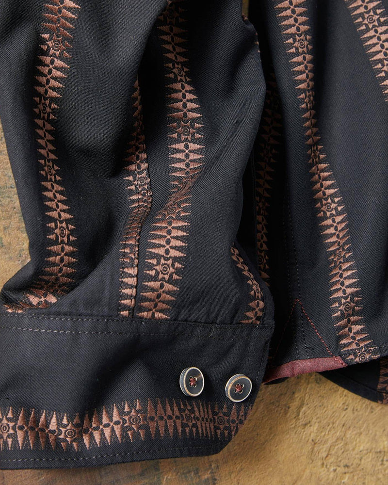 We're glad you've clicked on our new Long Sleeve Jacquard Stripe Shirt,Percussive brassy stripes up a moonless midnight base. Jacquard-woven – not printed – for lasting luster. Stone-style buttons. Pattern-matched pocket. Velvet-trimmed neck. Precise stitchwork all over.