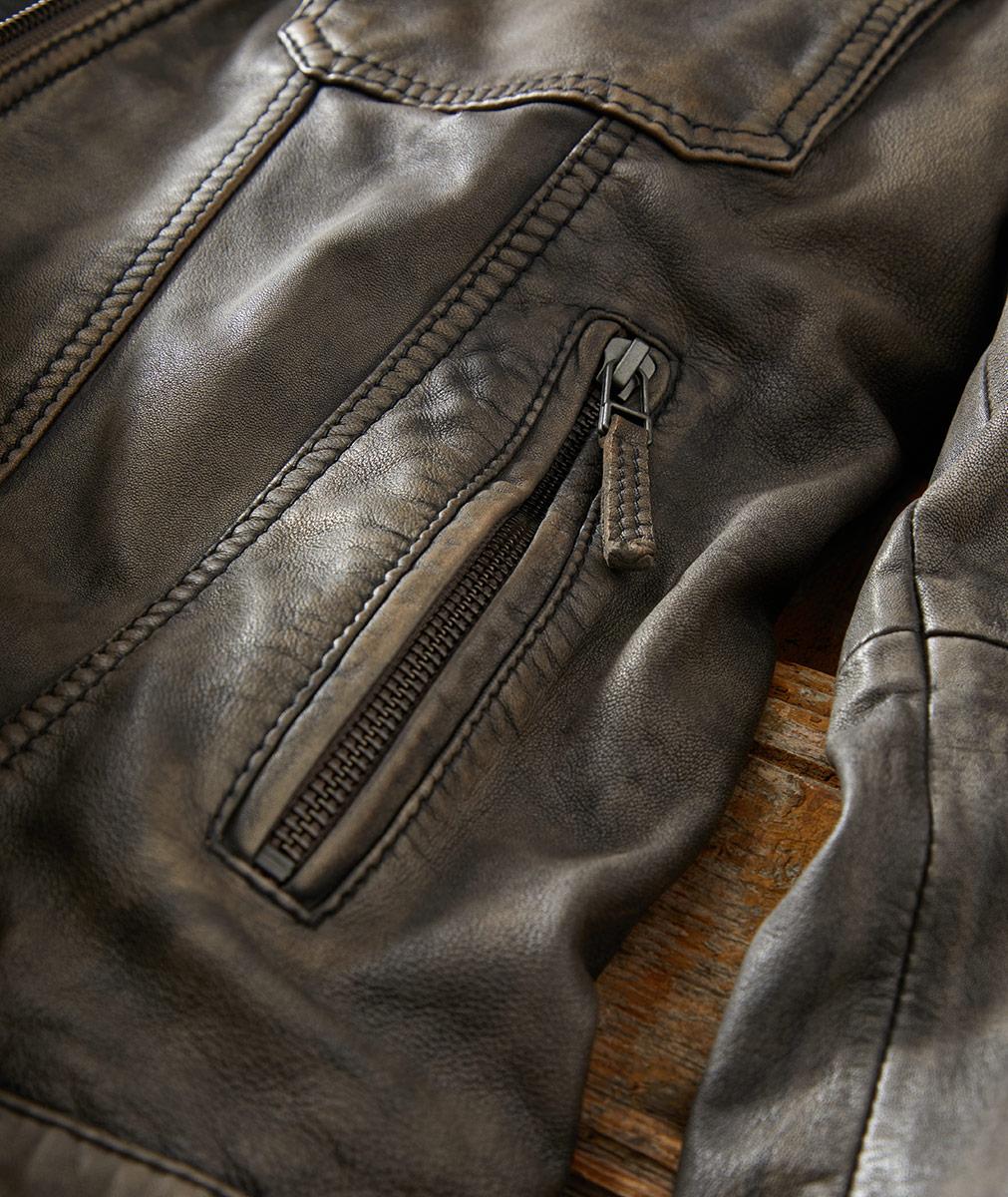 Exquisite Nappa sheep leather meets European-inspired craftsmanship. Sand-washed and hand-finished to achieve a vintage-cool patina, this moto jacket boasts substance in both looks and feel. Inside, you'll find a t-shirt soft jersey lining, plus a rib-knit trimmed collar. Two snap flap chest pockets, zippered handwarmer pockets, plus three interior pockets. Zippered cuffs.