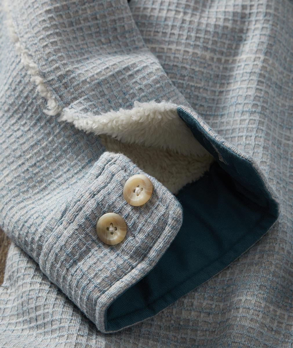 Featuring an eco-friendly faux sherpa fleece lining, the outside has raw-edge seams to give it a faux sheepskin look.
